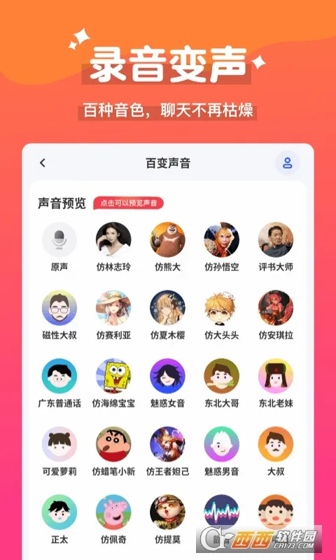 海量语音包:拥有巨火爆的海量语音包内容,像蜡笔小新、李云龙、土味情话等,轻松实现语音聊天交友。