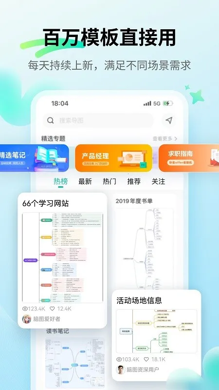 1、APP内置思维导图社区,这里汇聚超百万导图作品,涵盖教育、职场、个人成长等多领域,有大量精华内容供您汲取智慧、交流心得。