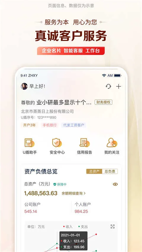 高效授权账户管家四合一:支持多笔指令一键批量授权,账户结构清晰,交易明细图表化,转账汇款流程极简,理财产品随心选购,实现掌上金融一站式办理。