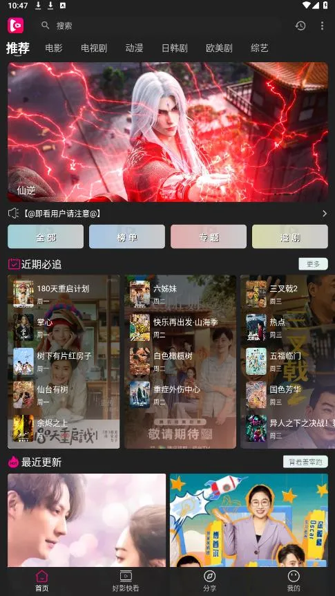 即看影视官方版优势显著。**免费无广告**,提供纯净观影体验,无需付费就能看最新影视资源。资源超丰富,电影、电视剧、综艺、动漫全涵盖,每日更新不断档,彻底解决剧荒。多设备适配佳,完美兼容各类安卓设备,大小屏都有极致体验,还支持投屏电视。操作超便捷,界面简约清新,功能布局合理,一键搜索、快速缓存、历史记录同步等功能轻松上手,让你尽情享受追剧乐趣。