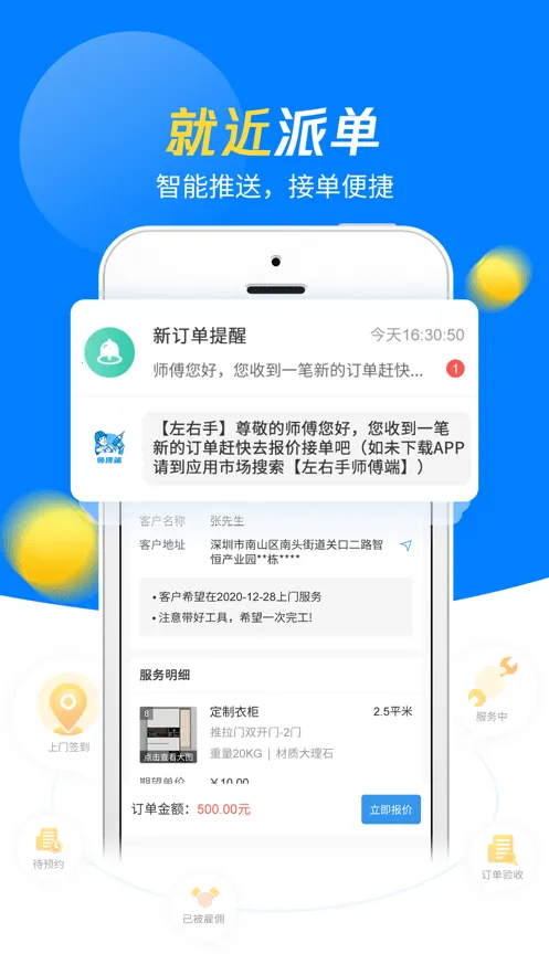 左右手师傅端是家具安装维修接单管理软件,零门槛入驻免费接单。有全国优质商户资源,智能订单管理,款项结算快。还能打造个人品牌,24小时客服在线,操作简单功能全,助师傅轻松赚钱。