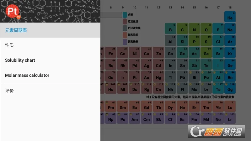 这款软件提供了118种元素的全面信息,涵盖原子、热力学、材料、电磁、原子核性质及化学性质等多个方面,满足用户深入学习的需求。