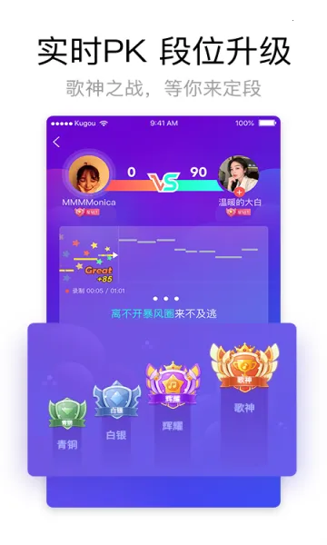 3、K歌直播:随时在线K歌互动,助力你实现主播梦想,与更多人分享你的歌声。