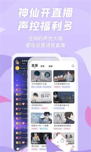 1、汇聚全网声优大咖,在这里语音直播,能与他们连麦互动,还有暖心主播陪你聊天哄睡唱歌。