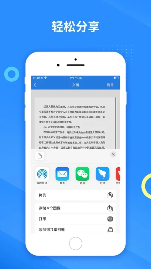 4. 便捷文档处理:能为扫描文件添加签名,连拍功能可合成电子文档,扫描后可对文档裁剪、旋转、增强等操作,还能管理文档,浏览、优化或删除。