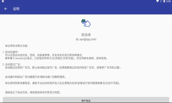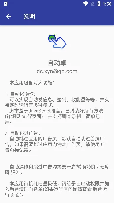 自动卓是一款手机系统工具软件,可设置多种自动化操作,如自动跳广告、自动点击、自动转发等。基于JavaScript语言,免Root,耗电量低。能自动签到、点赞、收能量,支持定时运行,界面简洁,安装包小无广告。