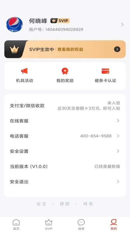 在功能方面,设备管理可在线添加各种收银机具;商户信息功能能详细编辑保存商户详情;刷卡收款方便快捷;账单管理可查看各项交易账单明细;磁条卡认证可处理磁条卡信息;开通SVIP能享受专属权益福利。