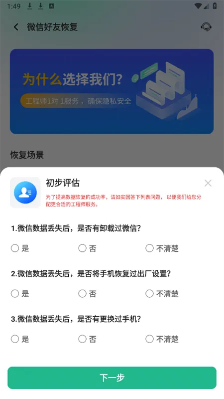微聊天记录精灵是一款超棒的社交软件聊天记录管理手机应用。它能分类整理微信和QQ聊天记录,还提供便捷的管理与导出工具。自动扫描或查找相关数据超方便,要是数据被删,也能预约专业工程师1对1咨询,用专业微信恢复软件找回。它的功能亮点超多,比如能恢复微信好友、聊天记录、图片、语音及红包记录等。还能全面扫描手机数据,导出照片、视频,深度扫描微信和QQ中的各类数据并一键批量导出,也支持批量一键永久删除扫描到的数据。而且用户可先预览被删除的微信数据,确认恢复内容后再付款。有了它,再也不用担心聊天记录丢失啦,轻松管理自己的社交软件聊天记录,真的太实用了! 关于需不需要root,软件本身在正常使用情况下是不需要root权限的,能在普通手机系统环境下稳定运行,放心使用就行。