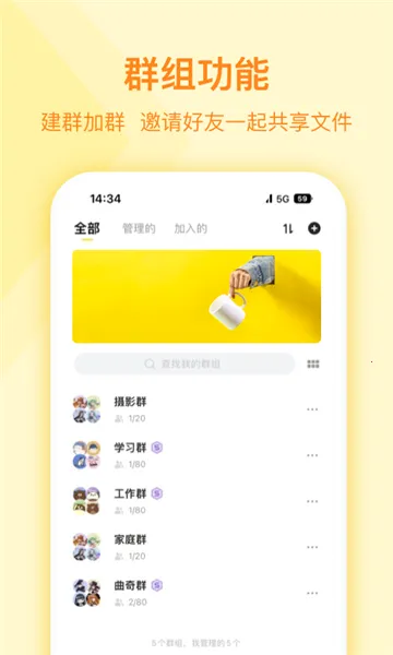 它功能超丰富,群组界面方便分类查看加入和管理的群组,搜索栏能快速找文件。群组详情页按类型筛选文件,查找高效。还有8类文件分类入口,规整清晰。初始就有2T存储空间,能容纳大量文件,还支持多格式在线预览。