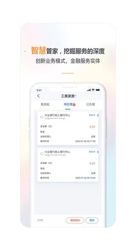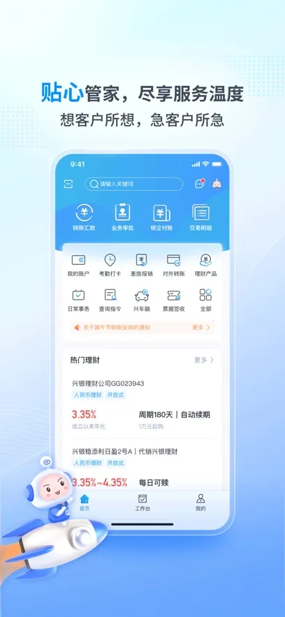 兴业管家(金融管理平台)优势显著。**管钱便捷安全**,支付结算顺心,财务流程定制,转账多样,代发一键完成;融资舒心,自助申请,额度自动审批,提款秒级到账;财富管理省心,专属理财随申随赎;安全有保障,生物识别等技术护航。**管事贴心高效**,财务管控规范,一站式差旅审批报销,提升效率;算税报税精准,降低企业成本;事务提醒实时,工作管理随心。**服务灵活智能**,开户流程简便,线上预约等省时省力;智能服务贴心,从用户视角推介产品;服务对接契合,可定制交互;客户旅程顺畅,服务无缝对接。
