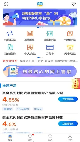 阜新银行2026最新版本是一款功能丰富的银行理财软件。可手机端办业务,如转账汇款、查余额等,有多种理财方式。界面全新,支持快捷转账、一键查询,提供安全服务,还能推送行业资讯,助您便捷理财。