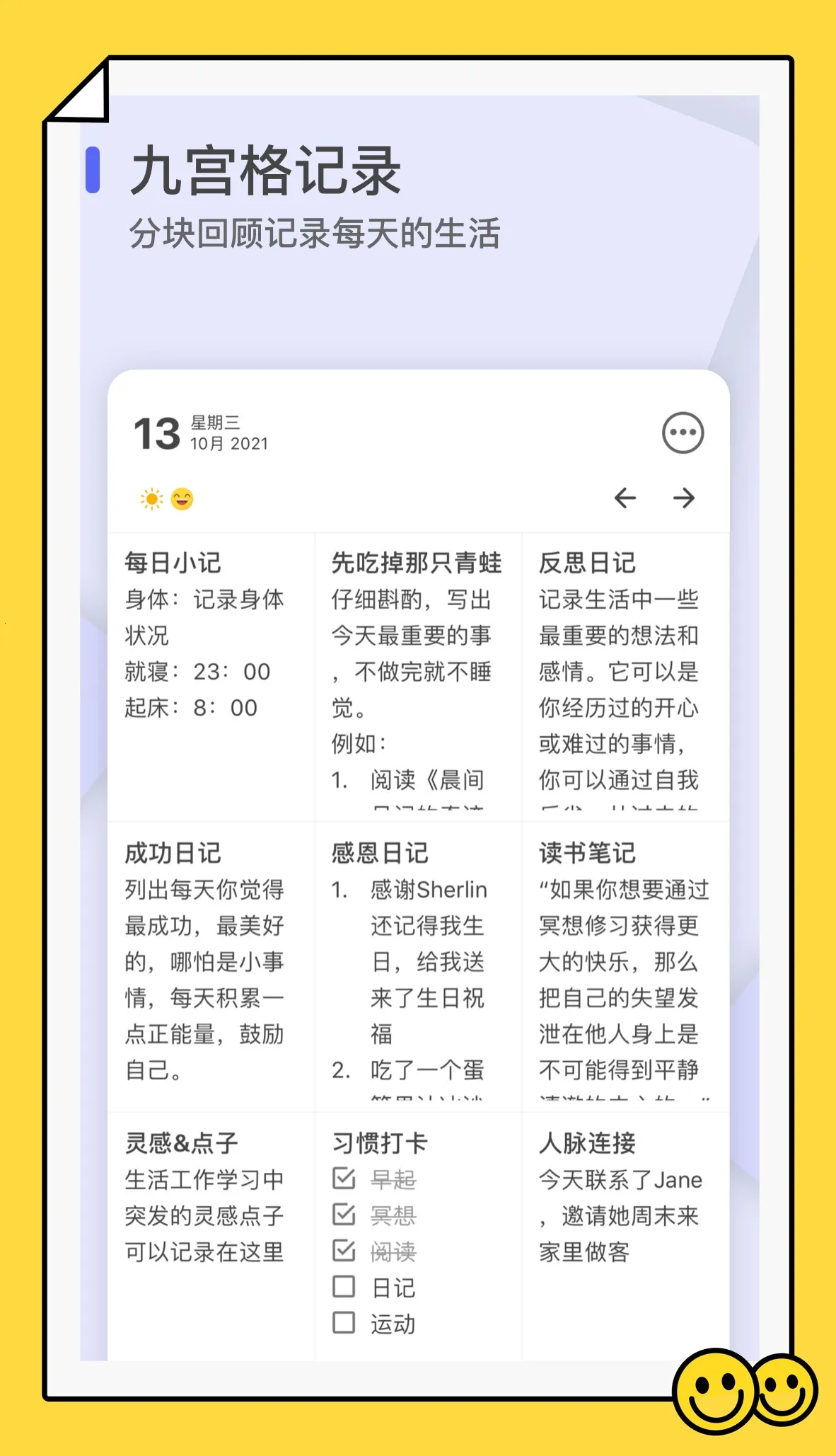 4. 格子形式的日记:独创强大且灵活的格子形式,使你专注于回顾、思考与记录本身,重新掌控记录日记的主动权。无需无从下笔,能更高效地进行每日总结回顾与反思,每填一格都有充实满足感。