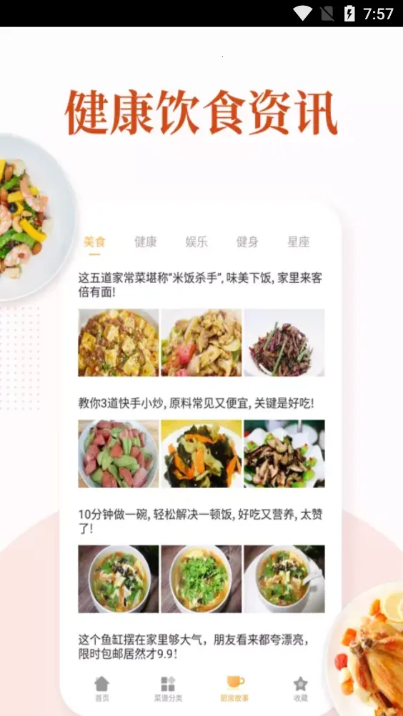 家常菜做法大全app有多种菜谱教程,操作简单易上手。能获热门菜式,有名师指导。涵盖丰富美食,定期推活动。菜谱图文搭配,可收藏,还能智能生成采购清单,离线缓存,助新手成大厨。