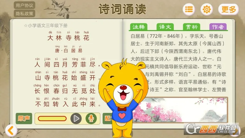 3. 提供优美诗词朗诵,可激发孩子的艺术细胞。专业的朗诵音频,让孩子感受诗词的韵律美和意境美,培养艺术审美。