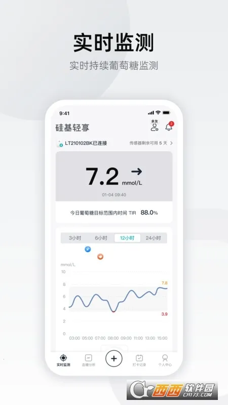 硅基轻享是深圳硅基传感科技有限公司推出的健康监测软件,可连接设备实时追踪血糖数据,有打卡记录、低耗电等特色,能分析血糖、生成报告,还有亲友监护等功能,方便用户管理健康。
