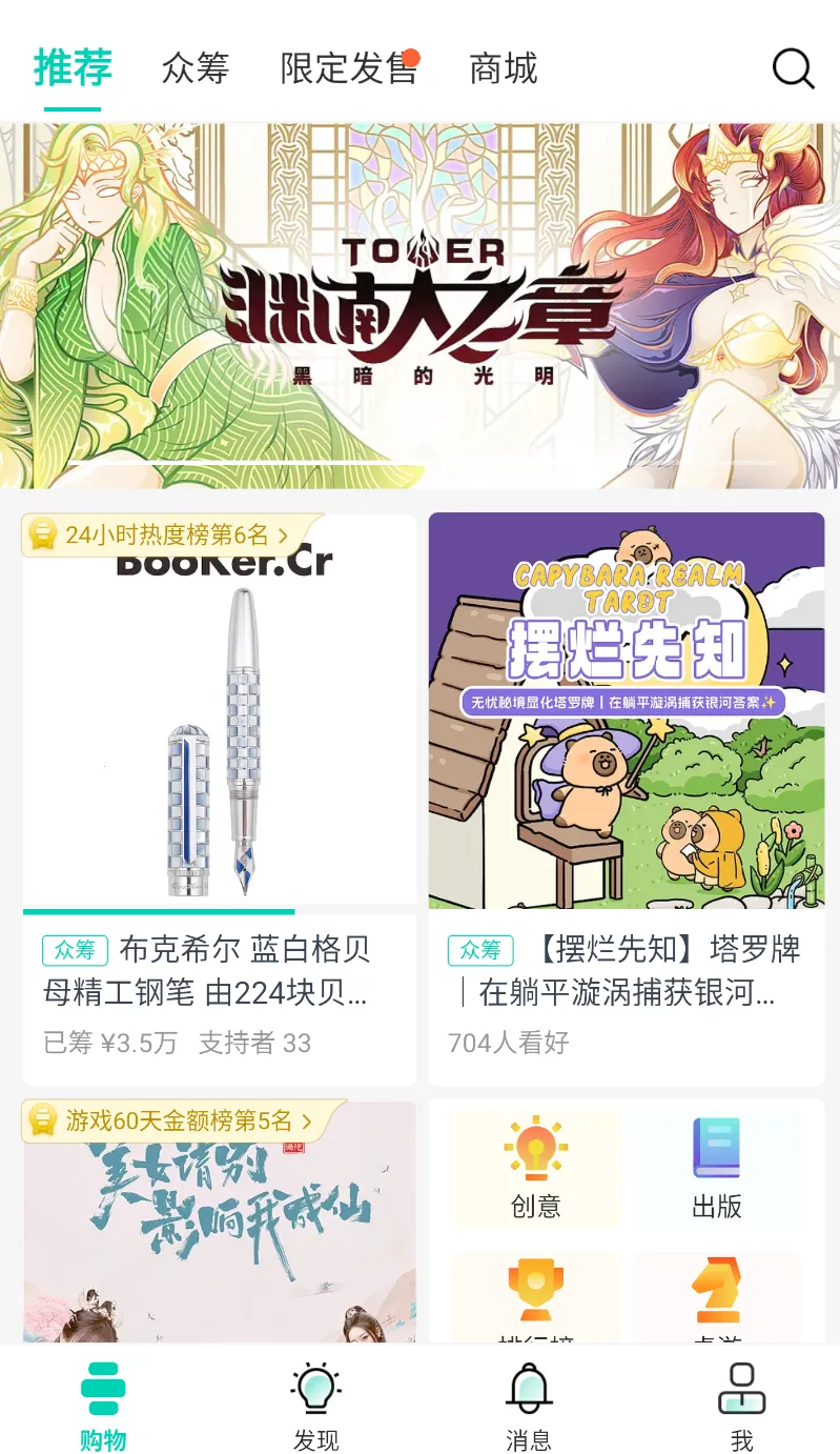 这款专注文创领域的平台,给人带来诸多惊喜。它是国内首家此类线上众筹预购平台,聚焦游戏动漫等品类。这里汇聚潮流玩具等独家首发新品,均为开发者原创独款好物,能带来极致购物体验。支持用户发起创意项目,轻松成为圈子文化输出者。