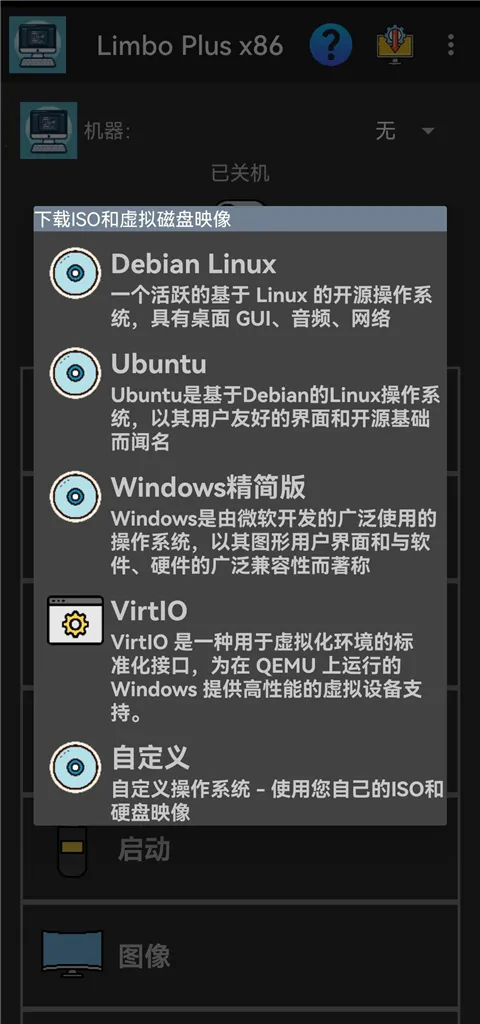Limbo Plus虚拟机是安卓端高性能虚拟机软件,可加载系统镜像模拟运行PC操作系统。支持多系统,能深度硬件自定义,有文件互传等功能。运行耗资源,流畅度取决于手机性能,首次配置需耐心,开源离线且对低配置设备友好。