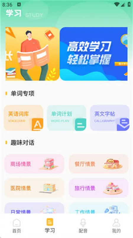 2. 全新方式:摆脱枯燥传统学习方式,通过配音提升口语听力,支持离线配音、离线合成及生词翻译。