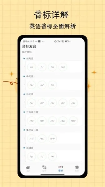 音标入门安卓版手机版优势显著。它专为英语初学者打造,提供丰富学习资源,涵盖48组基础与22组易混音标讲解练习。以直观教学视频和图文结合方式,助用户轻松学音标,快速提升口语。其音素级智能评测能依发音智能分析,给出个性化建议。跟读对比功能可让用户与标准发音对比找不足。还有大量练习资源,通过真人视频和图片精准演示发音要领,自然拼读训练助用户将音标用于单词发音,提高口语表达,让英语学习更高效。