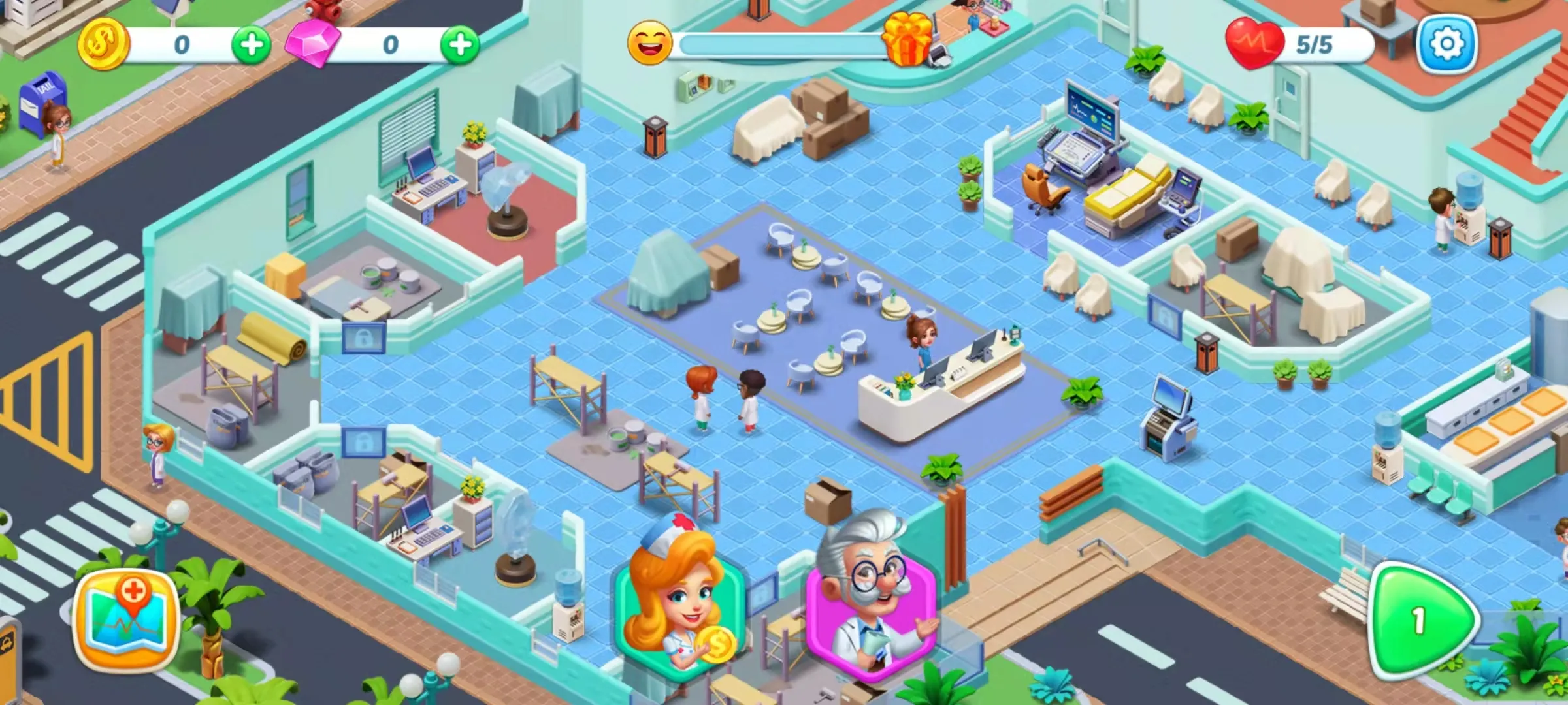 游戏包含多个不同主题关卡,玩法自由。不仅要使用各种道具治疗病人,还需摆设科室、装饰装潢医院,招揽医生护士打造专业团队,通过治疗病人赚取金币解锁更多场景。