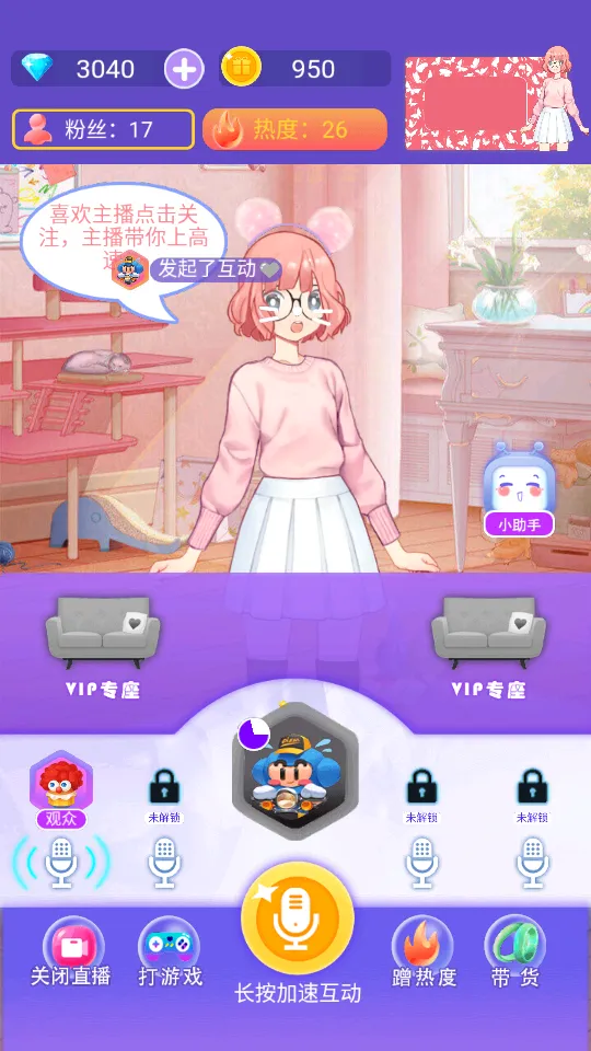 游戏亮点也不少。能自由定制专属发型提升颜值,可改变可爱外观,学会撒盐动作吸粉打造个人IP。每次直播能换外观造型保持新鲜感,培养各种才艺成为全能网红。快来下载体验,实现当网红的梦想吧!
