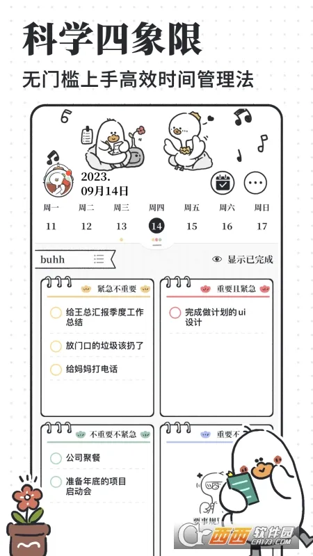 计划喵是一款结合可爱猫咪元素的日程管理软件。它界面简洁可爱,操作易上手,兼顾趣味性与实用性。软件支持多种科学管理计划和四象限计划列表,能帮助用户高效规划工作与生活。其优势众多,比如支持数据统计功能协助复盘专注计划,采用日历展示法方便查看工作安排,还有倒数日功能避免错过重要日子。特色功能丰富,像设有番茄工作法可让人高效工作并适当休息,撸猫馆能在休息时撸猫,支持设定桌面小组件方便查看计划表。总之,计划喵是一款能提升工作效率、让生活更有条理的实用软件,无论是日常计划制定还是任务管理,都能轻松应对,助力用户更好地管理时间和事务。