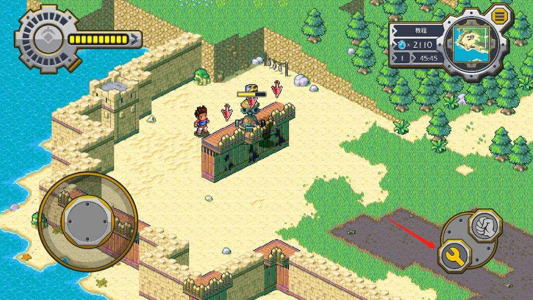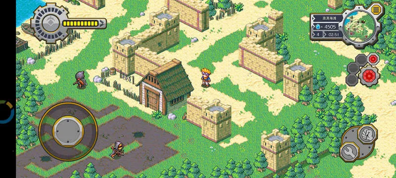 3. 便捷操作方式:正式开始后左边摇杆控制角色移动,右边按钮和NPC互动。战斗时点击左下方切换放置建筑,点击对应建筑后再点绿色对勾按钮放置。放好建筑后点击左上角红色按钮开始战斗,可操控角色上阵或看炮塔消灭敌人。