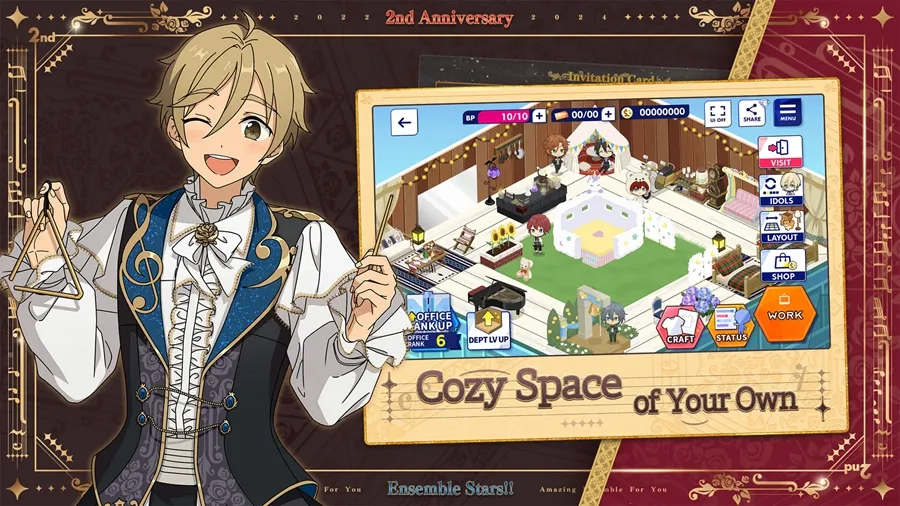 偶像梦幻祭2是基于前作世界观的续作,有49位风格各异的美少年,多达14个组合。玩家扮演制作人,陪伴偶像成长,通过打歌演出提升其等级。游戏支持3DLive形式,有多种曲风与原创音乐,特邀一线声优配音,带来沉浸式体验。