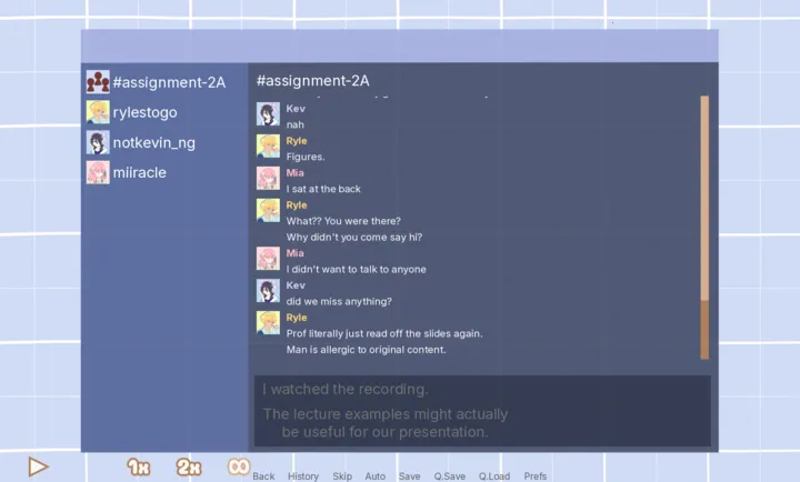 在大学可用性项目中,距截止日期仅剩5天,组长艾妮的组员却不想干活。玩家扮演艾妮,管理3名组员,通过类似Discord的聊天模拟器应对,有4种最终呈现方案和3种结局,未来可能更新。
