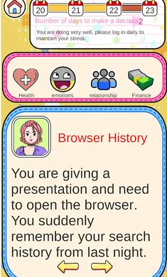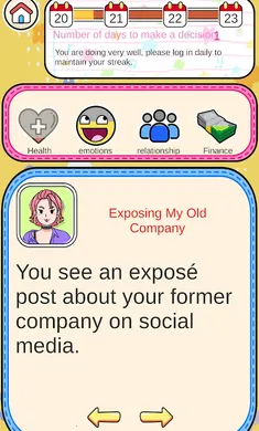 独特玩法:通过左右滑动做出选择,每个选择影响健康、情绪、人际关系、财务四大人生数据,玩法新颖有趣。