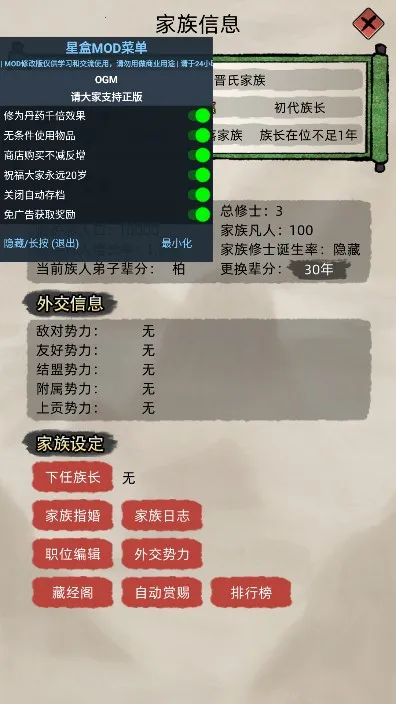 修仙家族模拟器破解版下载最新版6.0,玩家扮演家族老祖开创家族,在修真海域占领小岛发展。有独特血脉传承、十八代族谱,要应对岛屿争霸、经营家族,还有炼器炼丹等百艺,地图随机,每次体验不同。