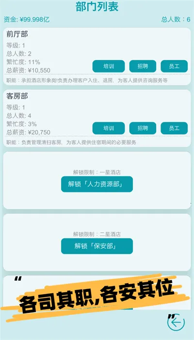1. 高度还原酒店经营全流程,从员工培训、部门协作到危机处理,每一处细节都贴近现实,带来沉浸式经营体验。