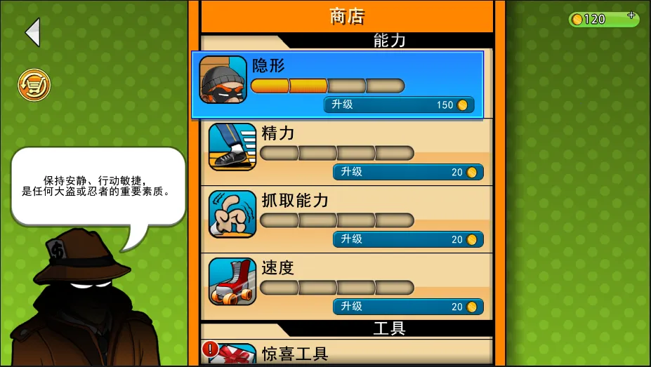 玩家扮演倒霉小偷鲍勃,完成一系列任务。在关卡中,要躲避守卫视线,合理规划路线窃取物品。还能升级能力,如速度、体力、抓取能力等,提升潜行实力。