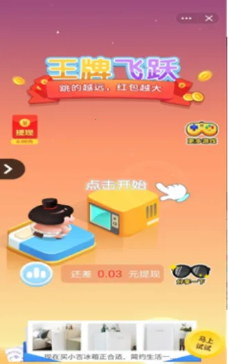 想体验超有趣的跳跃冒险吗?那就来试试王牌飞跃吧!这是一款类似跳一跳的小游戏,操作超简单,点击屏幕就能控制人物跳跃,按住屏幕还能决定跳跃距离,多练练手感,分数越高拿红包几率越大哦!游戏里关卡超多,难度后期逐渐增大,很考验操作和判断力。跳跃时间很关键,要根据平台距离把握按压屏幕时长。它是无限模式,永远没终点,能不断突破自我打破纪录。每次根据表现评价,还有机会得大额红包呢!新任务在右下角可随时查看,每个关卡有得分排行榜,跳动距离合适奖励越好。每天有新道具,还有特殊方块能连跳三级。音乐和特效带感,玩法多样,每关都有红包奖励,还能和好友PK,分数越高奖励越大,快来享受这欢乐的跳跳游戏吧!