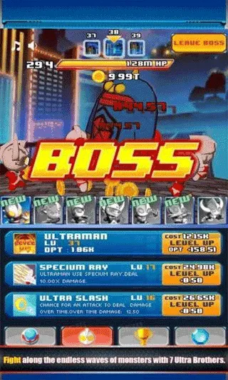 这是一款令人热血沸腾的手游。游戏高度还原奥特曼宇宙设定,带来丰富体验。玩家能操控七位经典奥特曼,他们各具特色,不仅外观还原,攻击模式、移动特性和必杀技机制都有差异。货币系统友好,战斗获金币且不随技能升级消耗,还能稳定增长。怪兽种类繁多,行为模式不同,需观察前摇灵活应对。玩法简单易上手,单指点击即可操作,新手30秒就能上手。但想通关高难关卡,要读懂技能逻辑、合理轮换阵容并升级战力。游戏集成多种超能力设定,技能组合自由度高。采用高清动态渲染技术,沉浸感十足。挑战模式无限波次,考验持久作战与决策能力。击败怪兽获经验升级,支持图鉴收集激活羁绊,每位奥特曼有独立培养线,深度养成乐趣无穷。