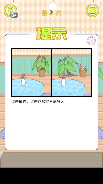 它的玩法简单易上手,点击屏幕收集道具,组合线索来藏好日记。刚开始关卡固定解谜找道具就行,后续会有动态机关、时间限制和声效干扰增加难度。像第1关按教程点开靠枕藏日记;第2关移开花藏花盆里。还有很多独特玩法,比如用魔法棒让滑梯变大象,借助大象跳上跷跷板弹飞日记等。