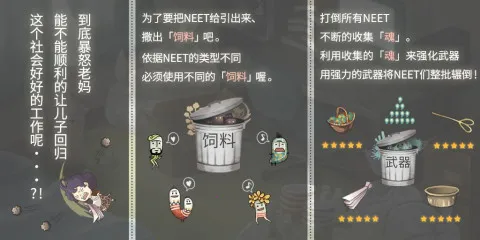 游戏玩法简单有趣,点击细菌就能消灭,还能获经验解锁图鉴和日记。武器系统丰富,不同武器对细菌效果不同,升级可提升威力。图鉴与日记能跟随剧情,见证儿子走出宅生活。饲料系统多样,设置饲料可滋生各种细菌,通过魂兑换获取,方便持续培养。