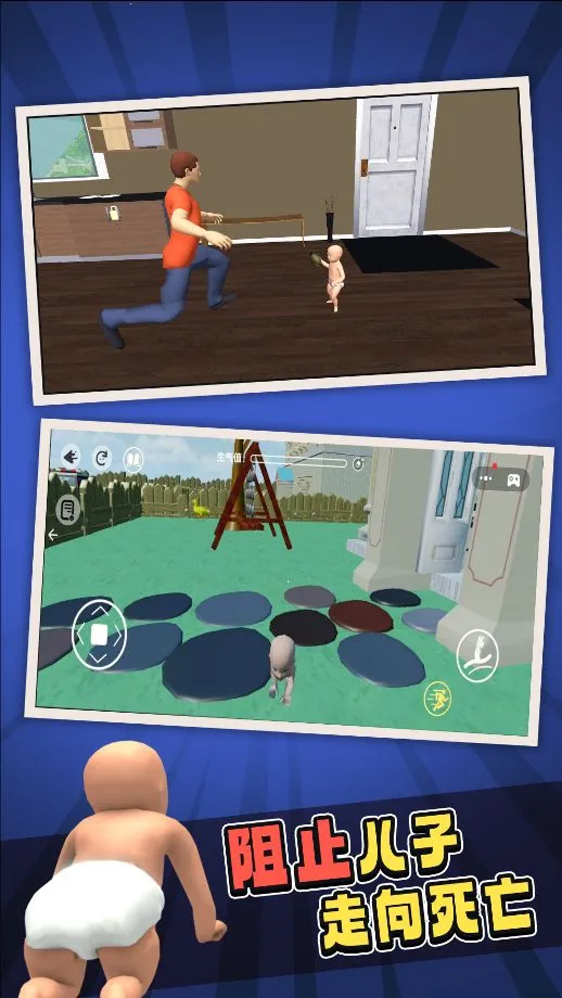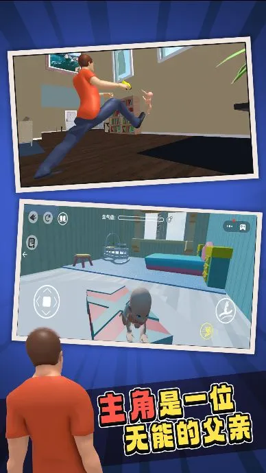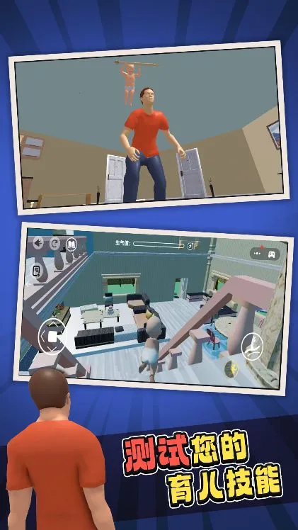 3. 儿子做出危险行为时触发夸张动画,爸爸手忙脚乱的追防过程充满喜剧效果,欢乐不断。