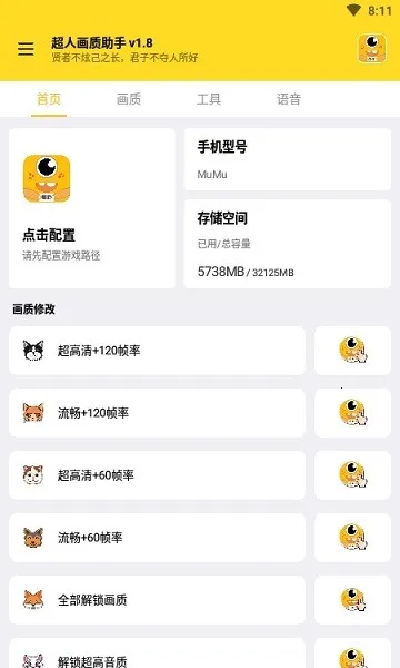 它功能超多,能一键提升画质,广泛兼容多款热门游戏。还能自定义游戏音质,调整音量。操作简单,不繁琐,适合所有人。不管啥手机型号都能用,能让游戏更清晰,告别渣渣画质,低配手机也能享优质体验,轻松成为吃鸡王!